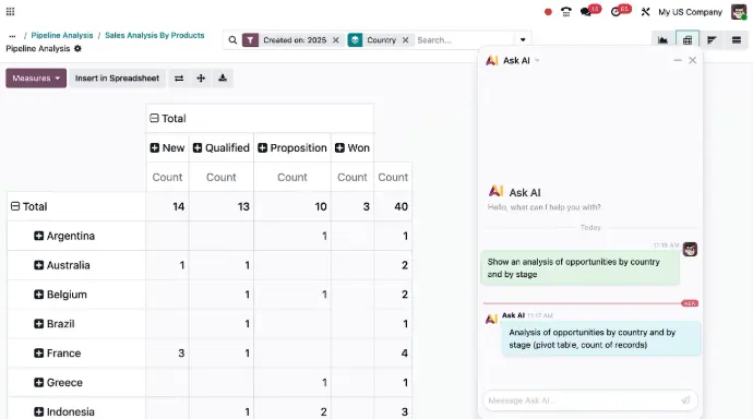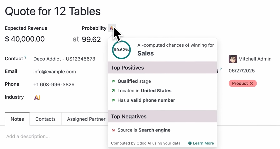 Durch KI-Unterstützung werden Leads automatisch angelegt, bewertet und optimiert. Odoo zeigt, welche Faktoren die Abschlusswahrscheinlichkeiten beeinflussen, fasst frühere Gespräche zusammen und hilft bei der Formulierung von Kundenantworten.