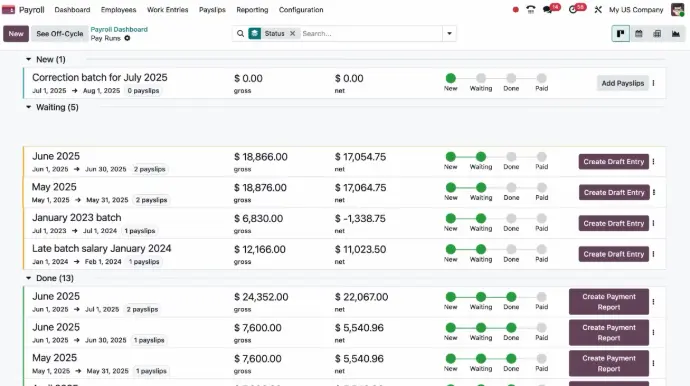 Im Modul Mitarbeiter & Payroll können frühere Beschäftigungszeiträume eingesehen und neue hinzugefügt werden. Eine übersichtliche Tabelle zeigt Anwesenheit, Urlaub und Homeoffice. Lohnläufe lassen sich mit wenigen Klicks durchführen und anpassen.