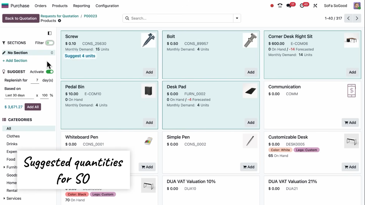 Den größten Mehrwert bietet jedoch die neue, innovative Procurement-Methode: Sie ist sofort einsatzbereit, benötigt keine Konfiguration und schlägt über einen intelligenten „Suggest“-Button automatisch passende Bestellmengen vor, die sich flexibel an Nachfrage, Saisonalität und Wachstum anpassen lassen.