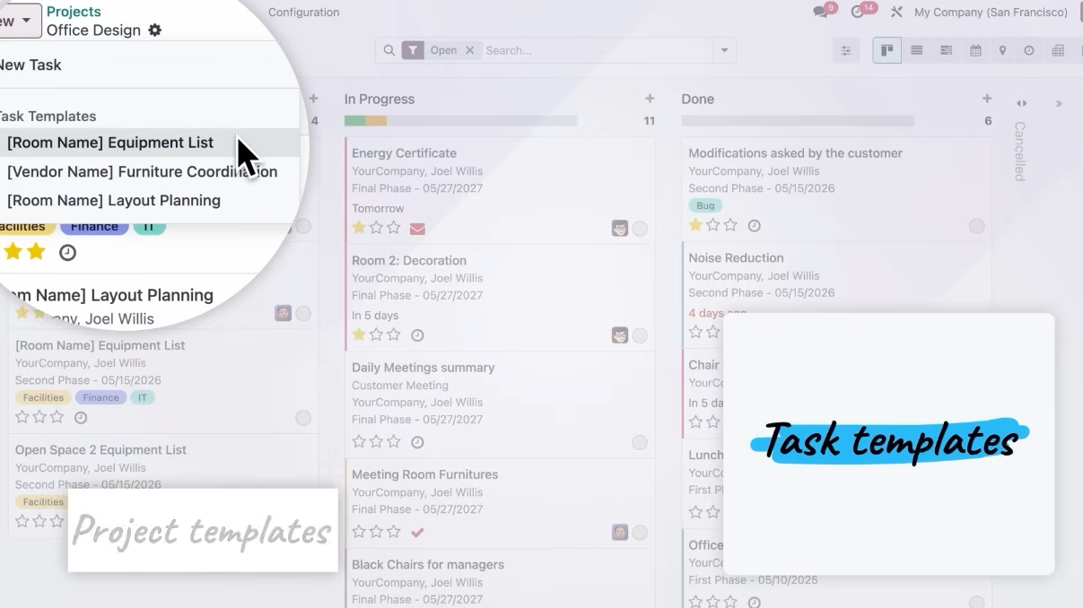 Im Projektmanagement lassen sich Projekte auf Basis von Vorlagen erstellen, wobei Aufgaben, Phasen und Zuständigkeiten automatisch angelegt werden. Neue KI-Automatisierungen übernehmen die Zuweisung der richtigen Experten.
